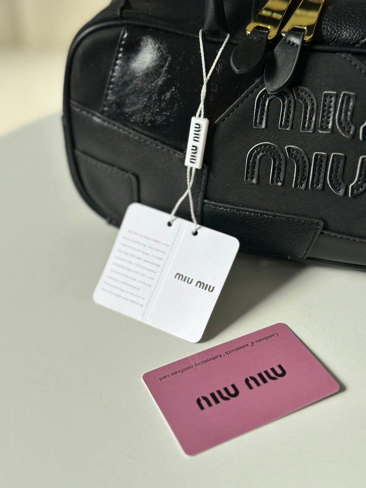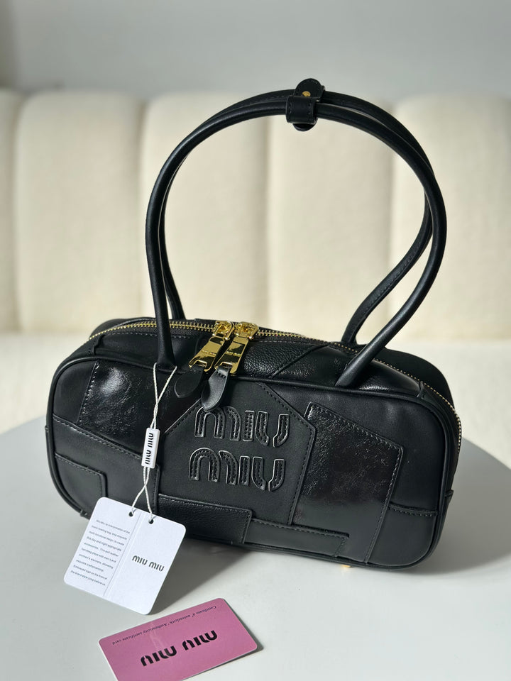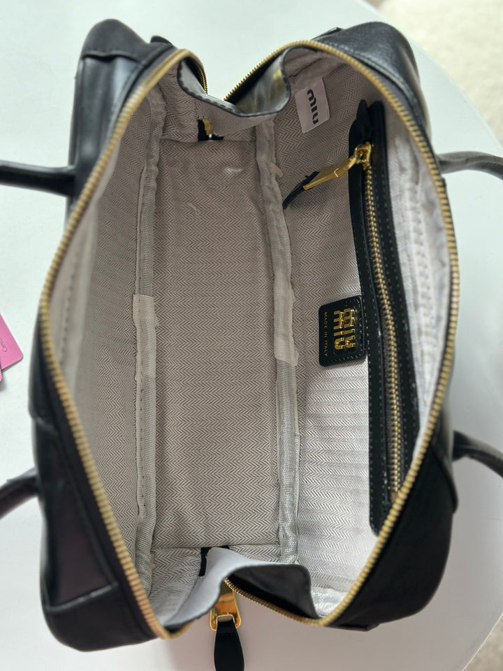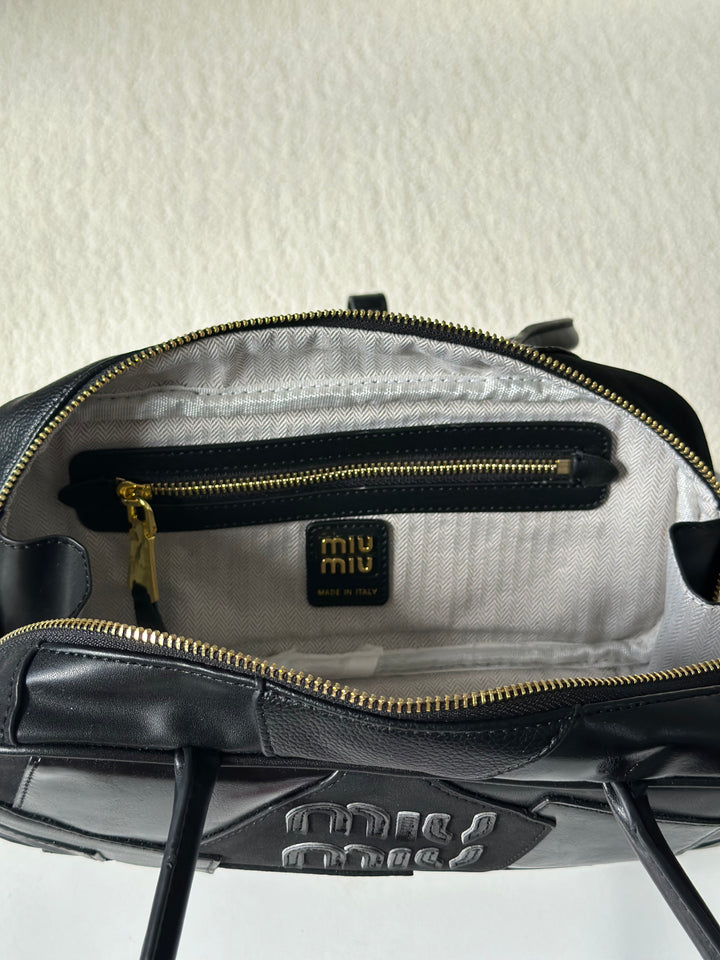 حقيبة ميو ميو مع ايد طويل مصنوعة من القماش المخمل والجلد