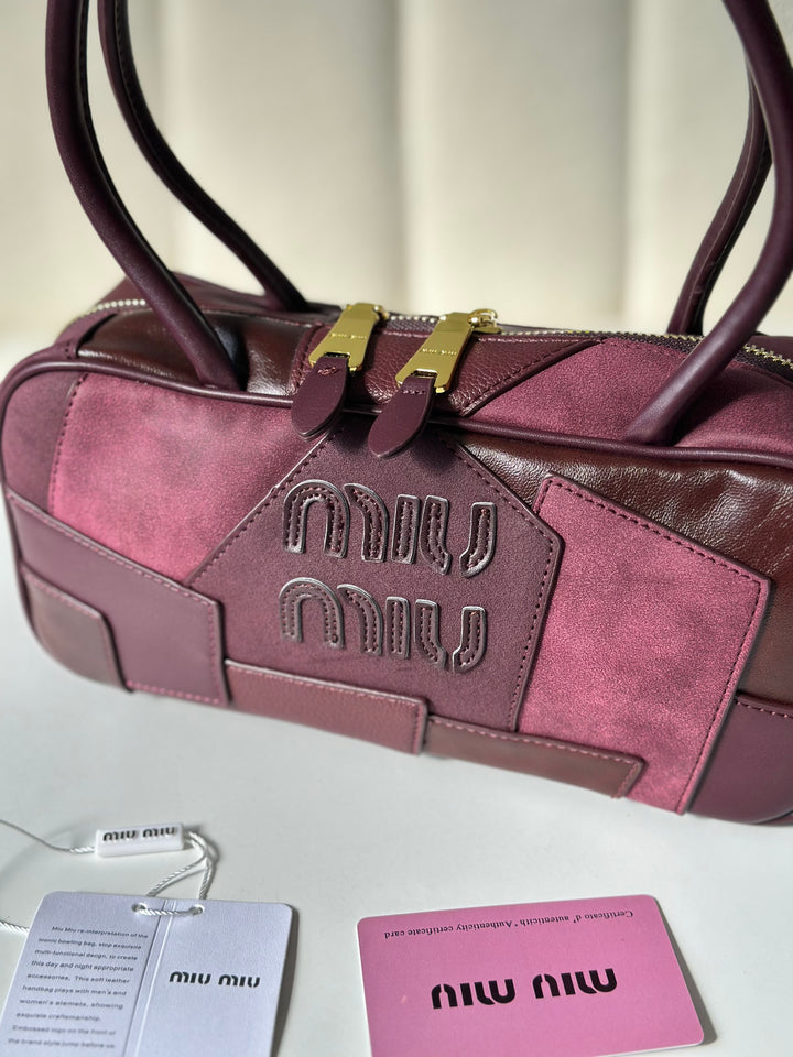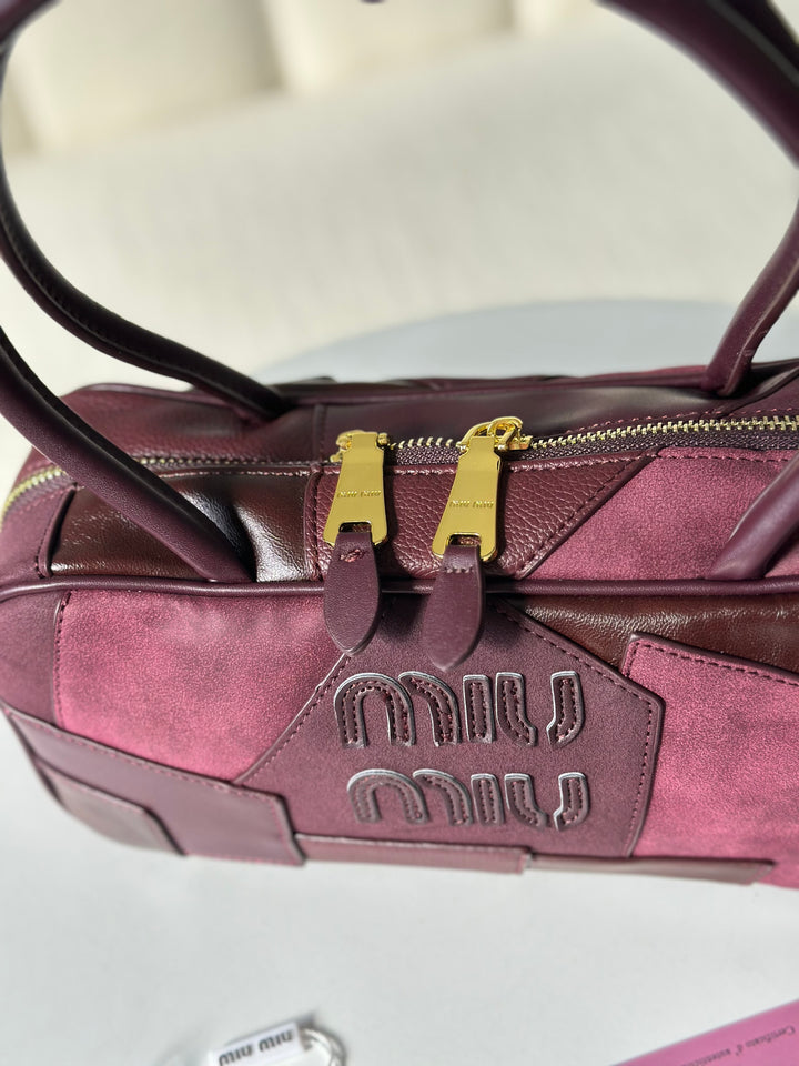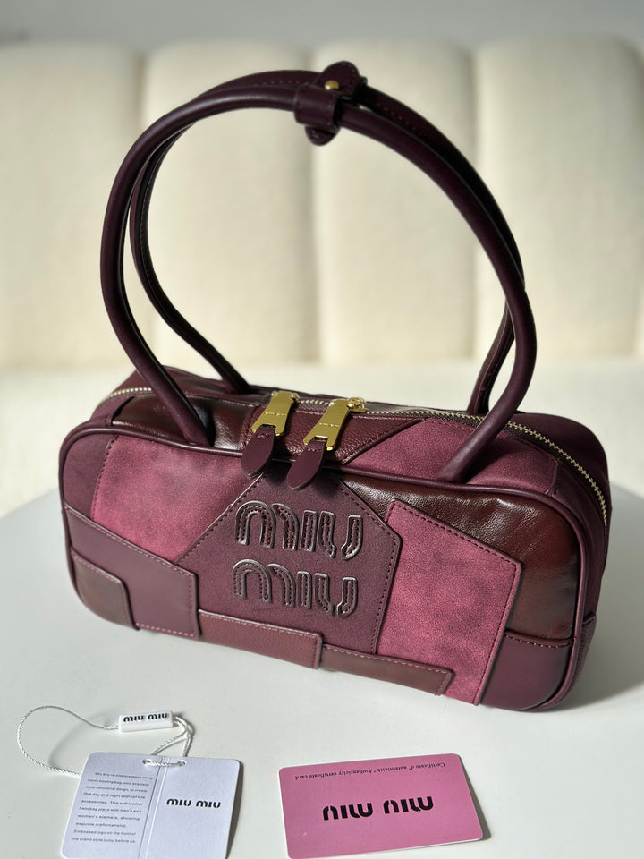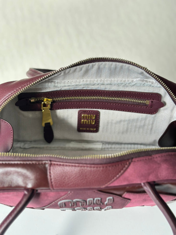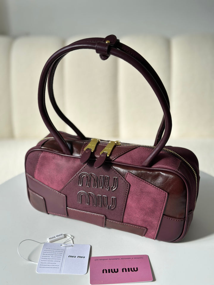 حقيبة ميو ميو مع ايد طويل مصنوعة من القماش المخمل والجلد