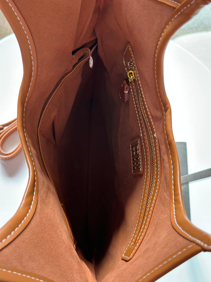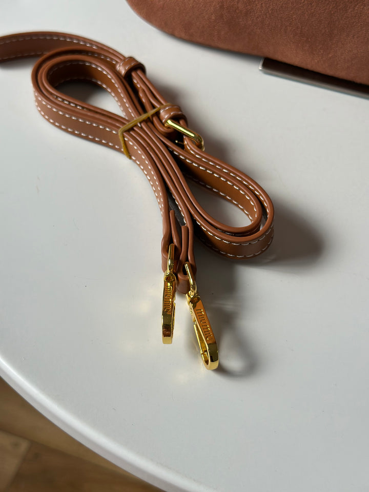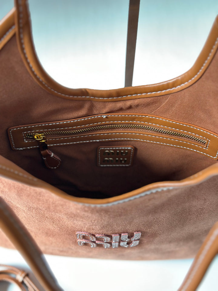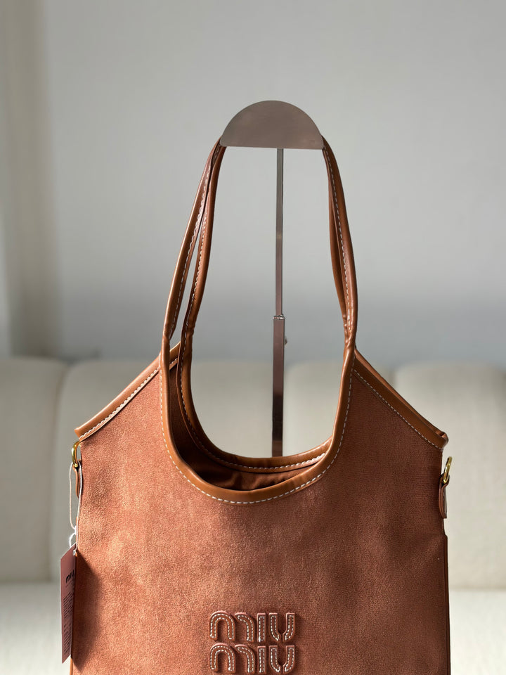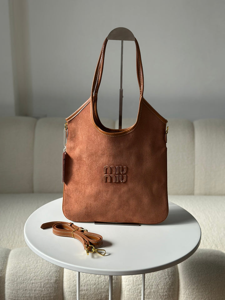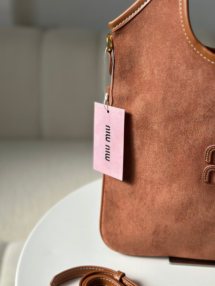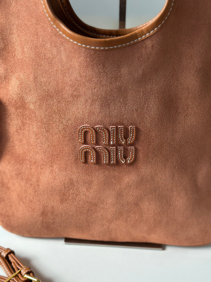 حقيبة ميوميو مع ايد طويلة وحزام اضافي يمكن ارتدائها باكثر من طريقة مصنوعة من القماش المخمل مع اطراف جلدية