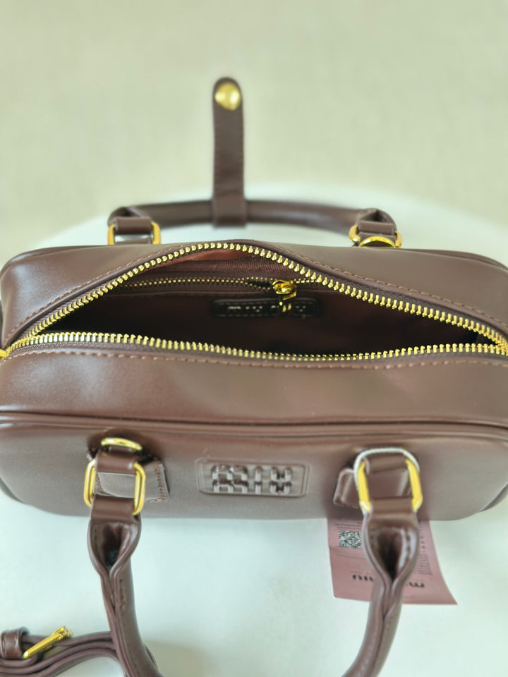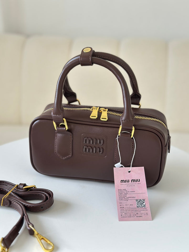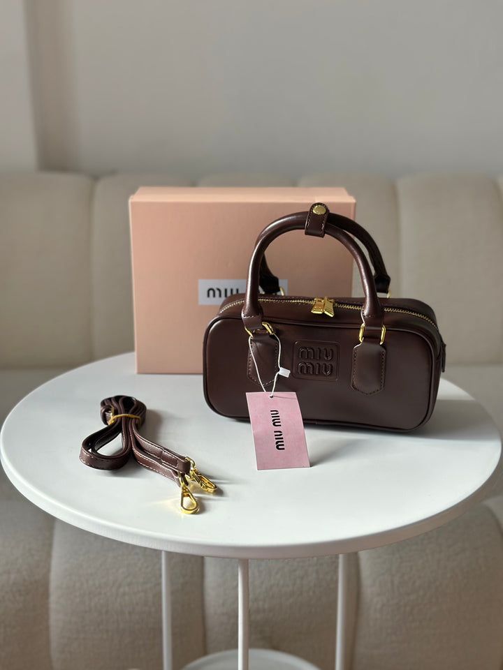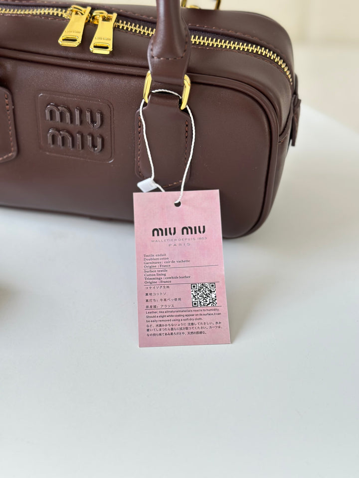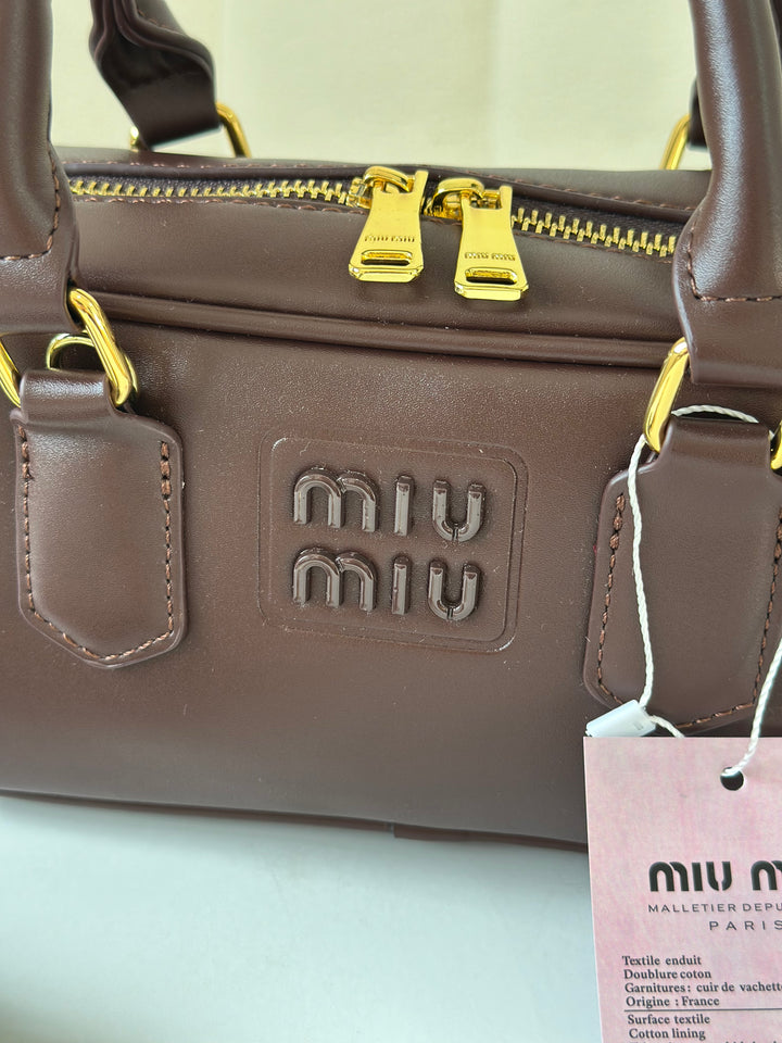 حقيبة ميو ميو مصنوعة من الجلد الاملس مختومة بلوجو معدن من الامام بالاضافة الى حزام وعلبة