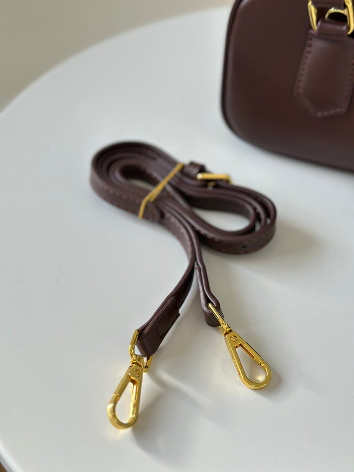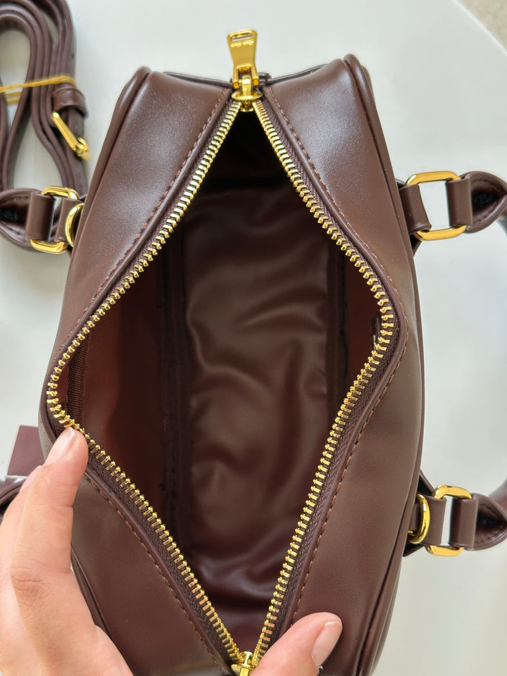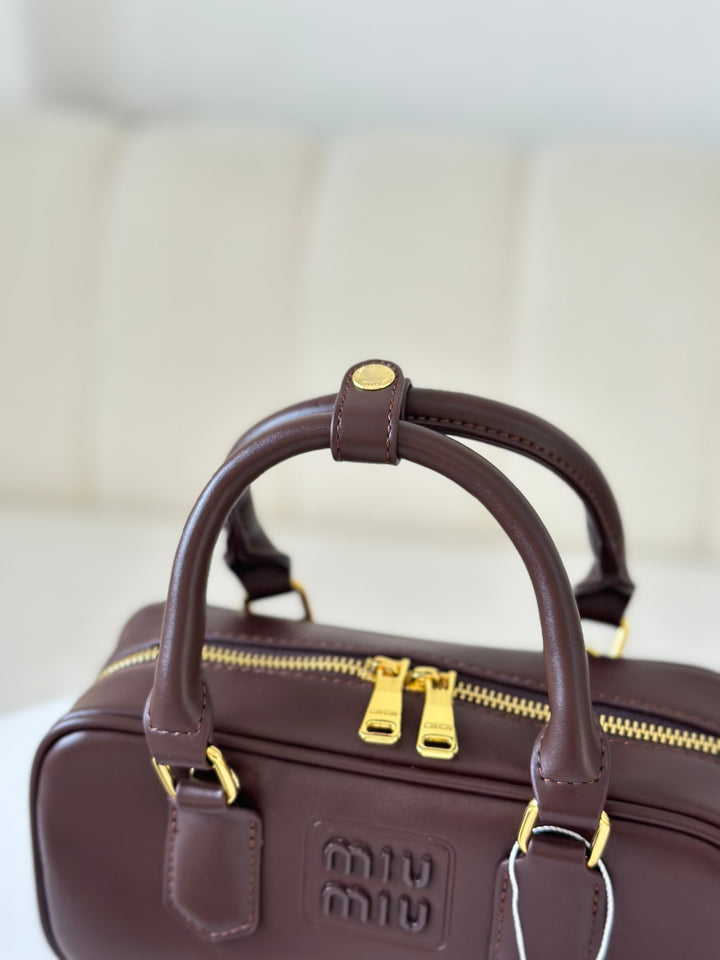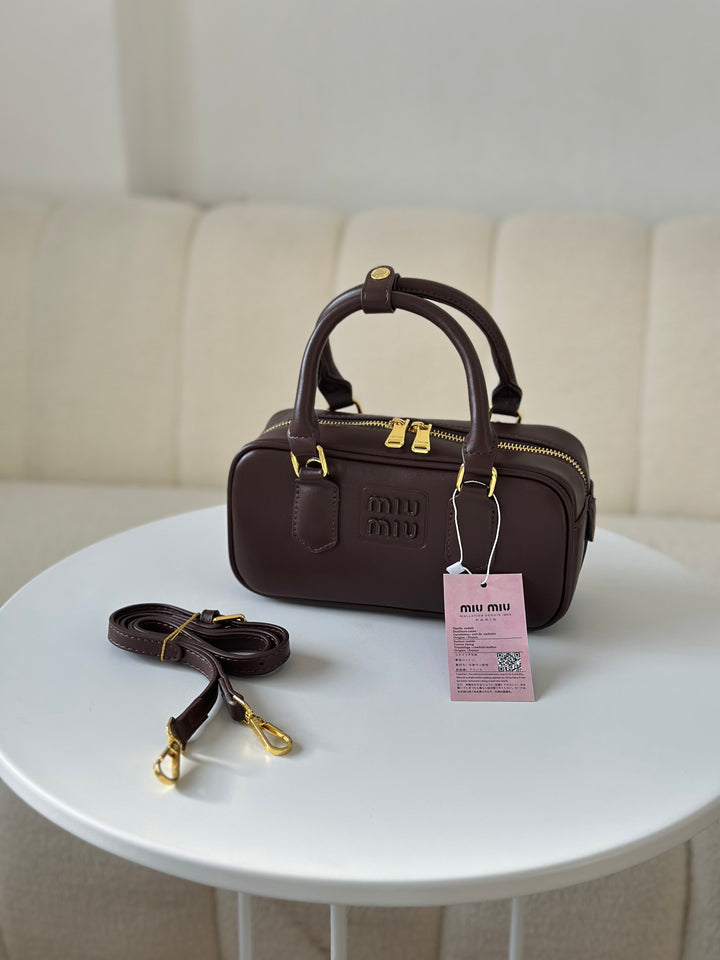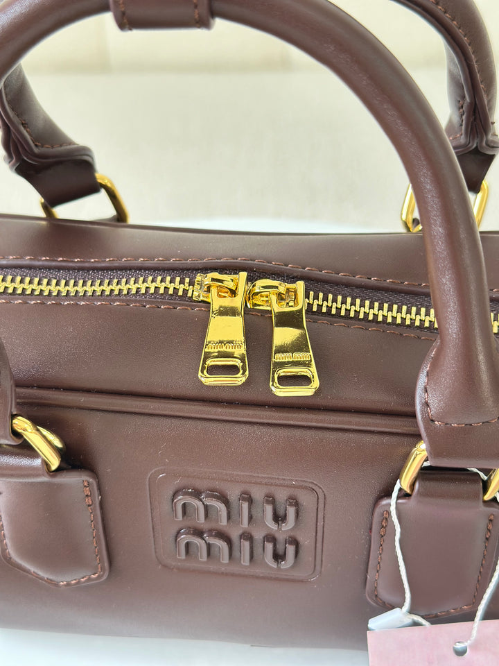 حقيبة ميو ميو مصنوعة من الجلد الاملس مختومة بلوجو معدن من الامام بالاضافة الى حزام وعلبة