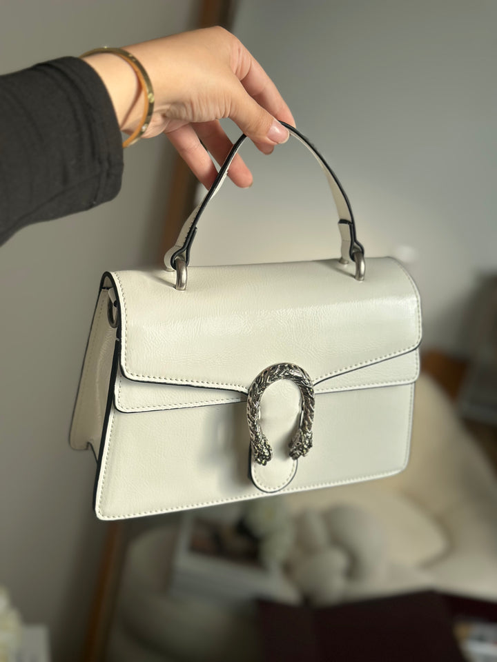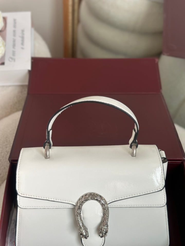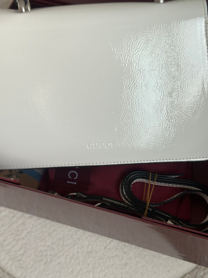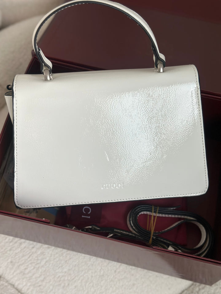 وصف للحقيبة: حقيبة جلد لامع باللون الابيض مع لوجو باللون الفضي تسكيرة فلاب بالاضافة الى حزام كروس وعلبة وغلاف ستان باللون البرغندي